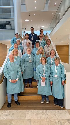 Nach einer Begrüßung im Institut für Sozialmedizin und Epidemiologie führte der Weg in die Biomedizinische Forschung. Dort stellte Projektleiter Timo Gemoll das Projekt vor. Anhand anschaulicher Beispiele zeigte er, wie genetische Veränderungen zu fehlerhaften Proteinen und damit zu unkontrolliertem Zellwachstum führen können – und warum eine verbesserte Früherkennung entscheidend ist, um Leben zu retten. Anschließend stellen sich die Projektpartner anhand von Postern vor und erläuterten ihre Rolle im Projekt. Ein Höhepunkt war der anschauliche Vortrag von Prof. Keck, Leiter der Klinik für Chirurgie, der die klinische Relevanz zystischer Neoplasien verdeutlichte und viele Fragen aus der Gruppe aufgriff.
